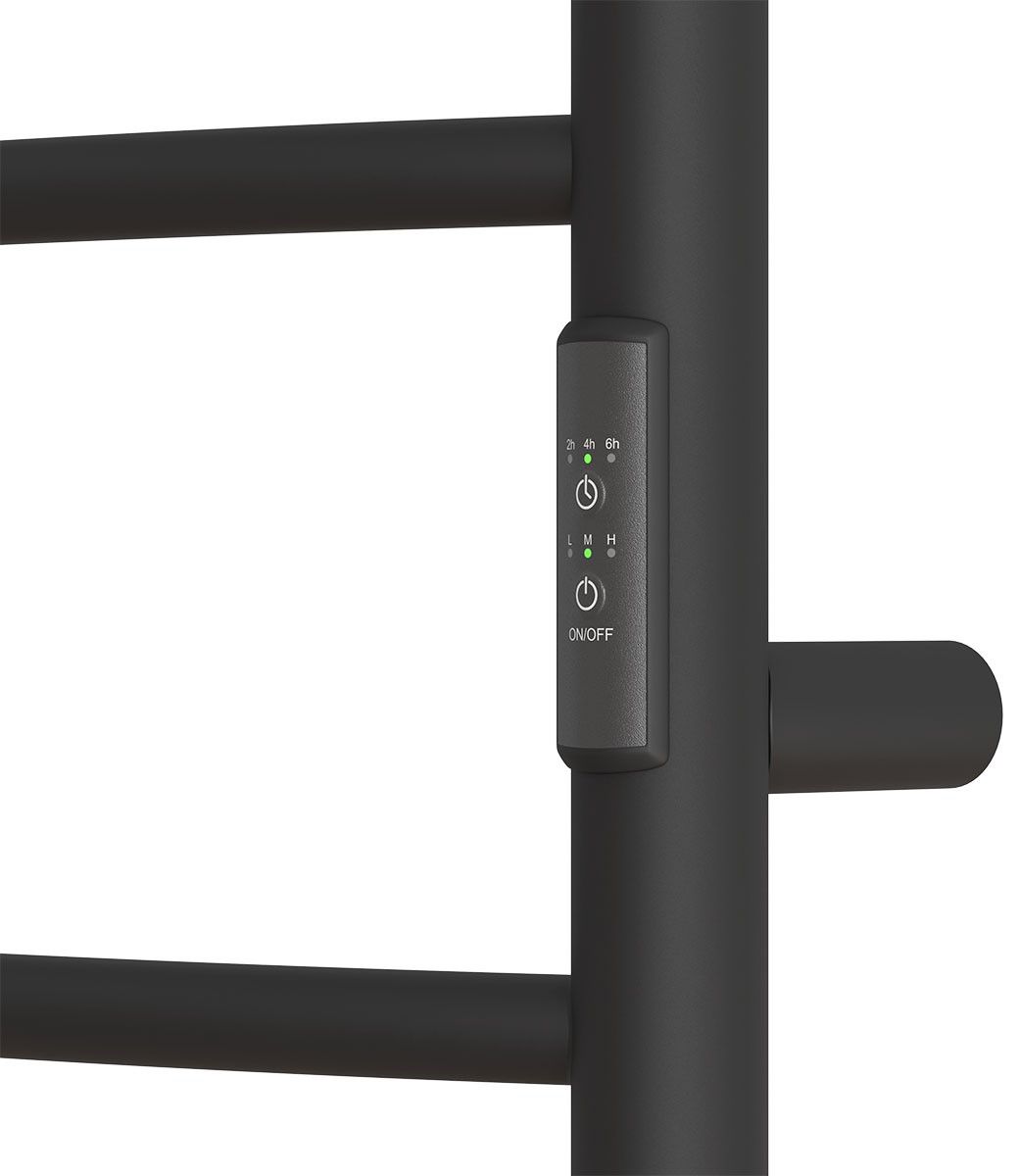 Электрические полотенцесушители с греющим кабелем Афина с полкой в цвете черный матовый (RAL 9005) и белый матовый (RAL 9016) выполнены из конструкционной стали с толщиной стенки 1,5 мм.Полотенцесушители оборудованы блоками управления с таймером (3 режима - 2,4,6 часов) и возможностью регулировки температуры (3 температурных режима). Блок управления расположен на правой стойке.