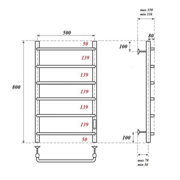 Полотенцесушитель электрический Point PN08858 П6 500x800 диммер справа, хромКомплектация: