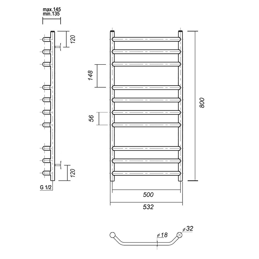 М/о расстояние (межосевое расстояние): 500Количество перекладин: 10Коллекция: ЛаураТип: водяныеЦвет: хромШирина (мм): 532Высота (мм): 800Глубина (мм): 145-135Вес: 5,94Объем: 0,070Страна: РоссияГарантия: 10 лет