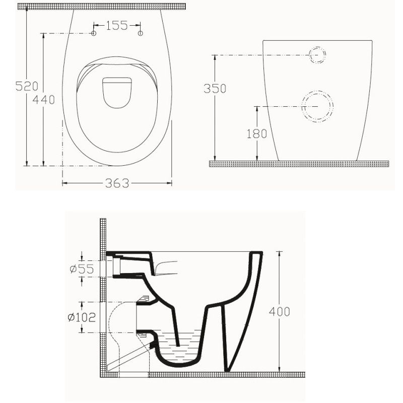 • Прилегание унитаза к стене: