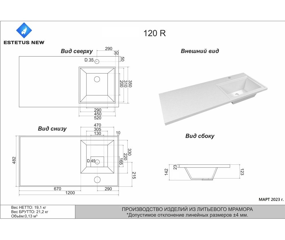 Раковина для мебели Style Estetus Даллас СС-00002389 правая 120 смРазмер(ШхГхВ): 120,2 х 48,2 х 14,5 см