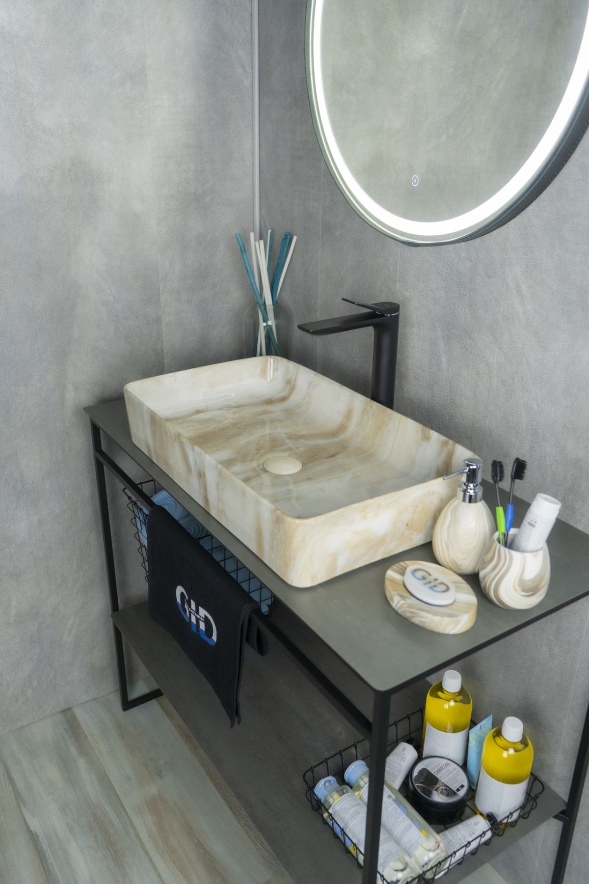 Серия Geometrico с прямоугольной формой: стиль и практичность с испанским качеством и европейскими стандартами. Раковина накладная GiD Mnc596— элегантная модель прямоугольной формы, изготовленная из высококачественной керамики с глянцевой поверхностью, создающей эффект натурального камня. Её строгий и современный дизайн идеально подойдёт для ванных комнат в минималистичном или современном стиле. Модель не имеет отверстия под смеситель, что позволяет использовать различные варианты настенных или встраиваемых смесителей, предоставляя свободу в дизайне интерьера. Раковина предназначена для установки на столешницу, подчёркивая стильный и функциональный интерьер ванной комнаты.