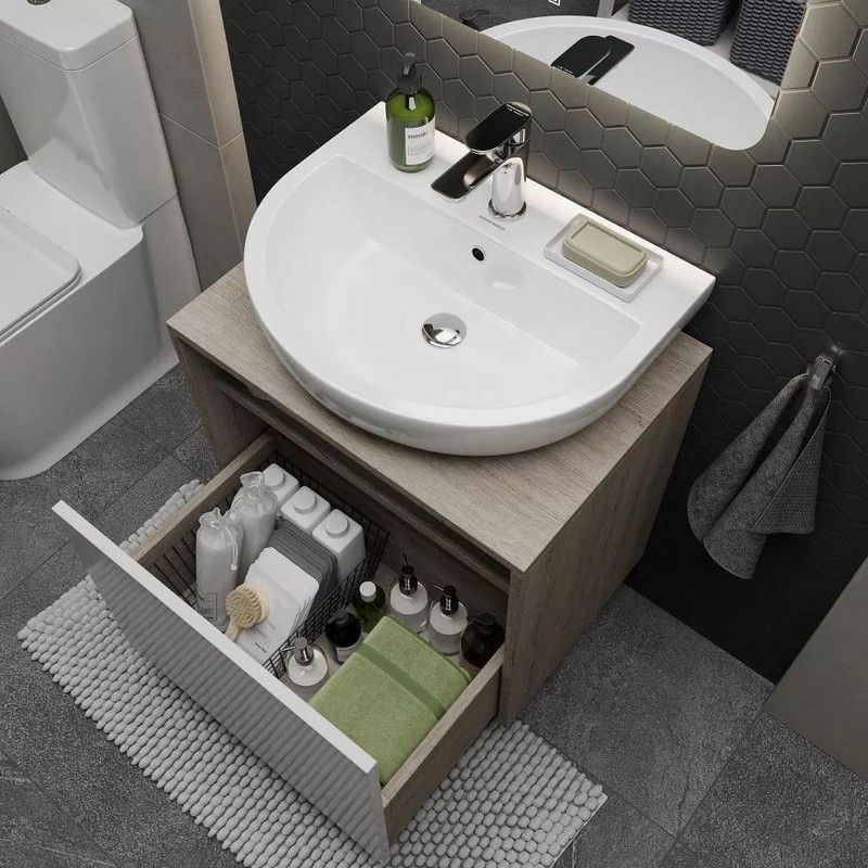 Подвесная раковина в белом глянцевом цвете с переливным отверстием и хромированной накладкой, ширина 55 см. Может использоваться с подвесными тумбами PRO