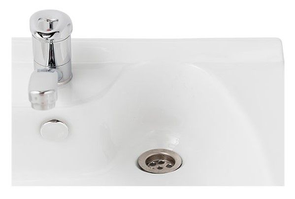 Раковина кувшинка Юни 60 отечественного производства выгодно отличается от импортных аналогов вертикальной системой стока воды. Такая конструкция сводит к минимуму вероятность образования засоров, обеспечивает быстрый сток воды из раковины. Слив проходит не над машинкой, а за ней, поэтому даже в случае протечки вода не попадет на технику и не вызовет короткое замыкание.
