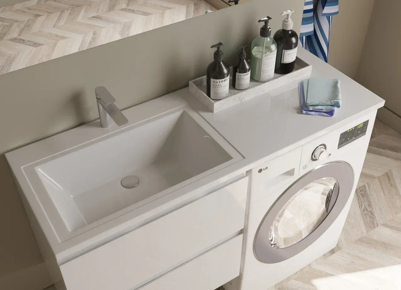 Изящнаая раковина гармонично впишется в любой интерьер ванной комнаты и позволит рационально использовать пространство над стиральной машиной.