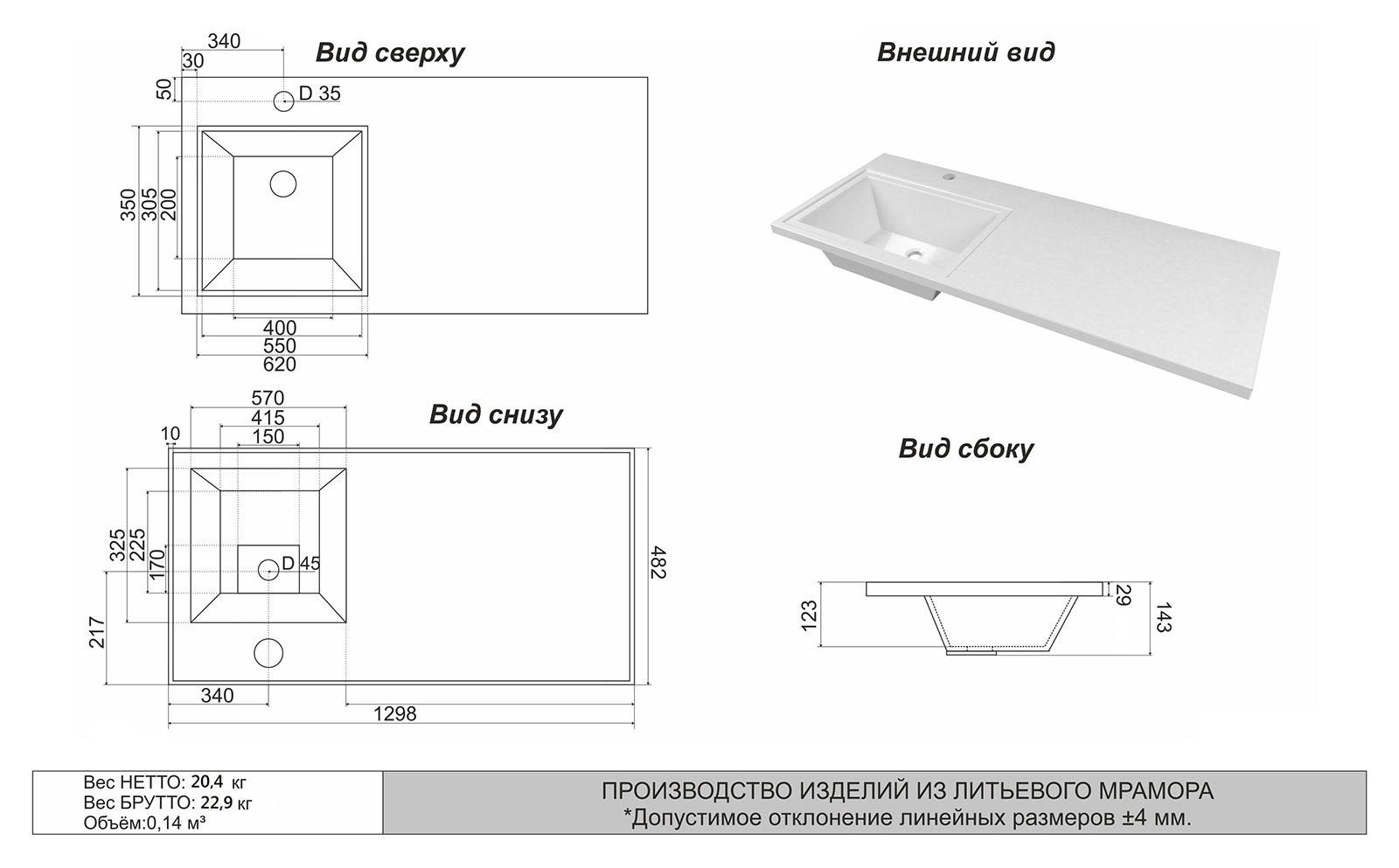 Тип: раковиныПо форме: прямоугольныеРазмер, мм (ШxГxВ): 1298x482x137Размер в упаковке, мм (ШxГxВ): 1328x512x167Цвет: белыйВес с упаковкой, кг: 27.76По монтажу: мебельнаяМатериал: литьевой мраморОсобенности: установка над стиральной машиной, со столешницей