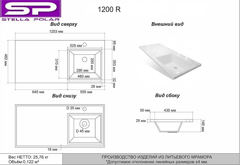 Раковина над стиральной машиной Stella Polar Мадлен 120см правая белый мрамор SP-00001153 купить