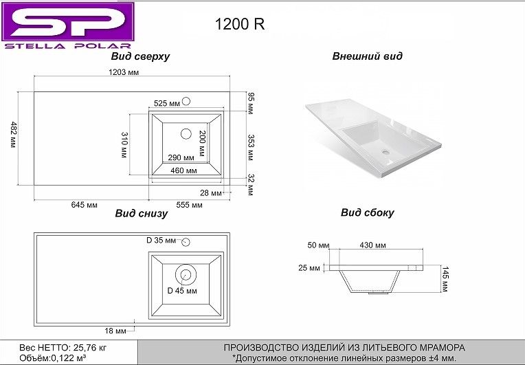 Раковина над стиральной машиной Stella Polar Мадлен 120см правая чёрный мрамор SP-00001072 купить