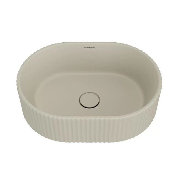 Песочная (бежевая) матовая накладная раковина без отверстия под смеситель, ширина 50 см. Донный клапан входит в комплект. Раковина устанавливается на тумбы Atollo и на столешницы и тумбы Plaza. Возможно использование с высокими смесителями или со смесителями, монтирующимися в стену Внимание: для чистки черных и цветных изделий можно применять только мягкую губку и мыльный раствор. Использование моющих и абразивных средств запрещено.