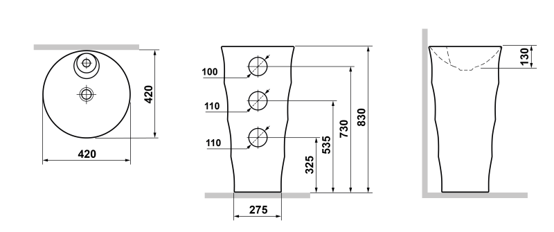 Цвет белый. Раковина с отверстием под смеситель; с отверстием перелива.