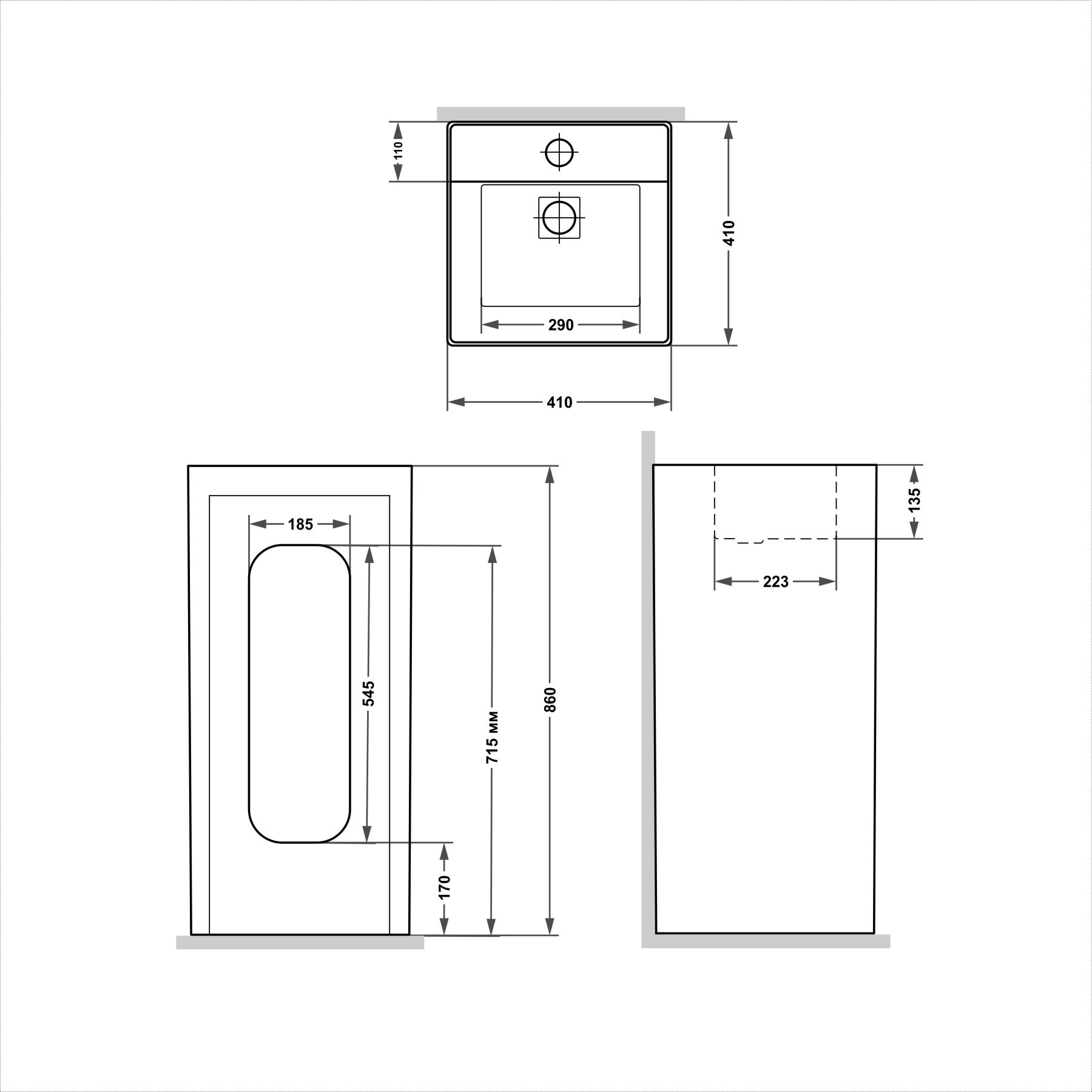 Цвет белый. Раковина с отверстием под смеситель; с отверстием перелива.