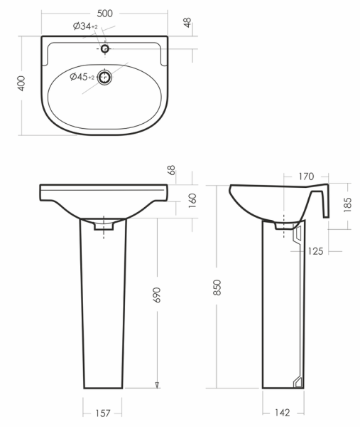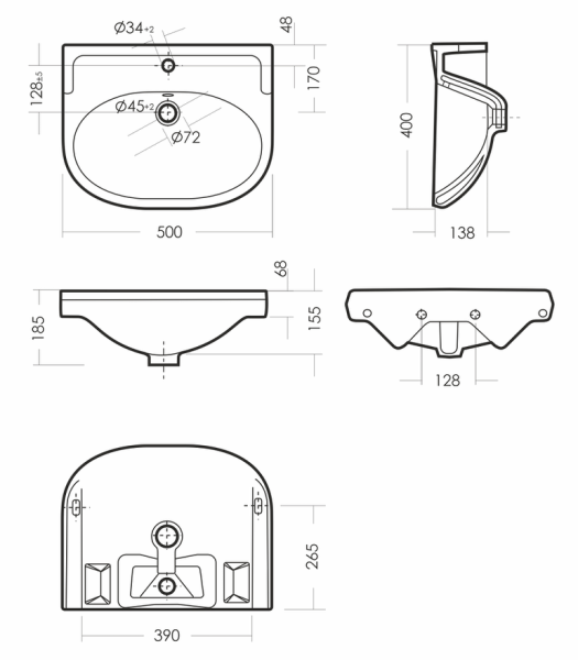 Размеры умывальника: 500 x 400 x 185