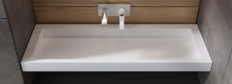 Раковины выполнены из матового Corian, в новаторском дизайне со скрытым сливом.