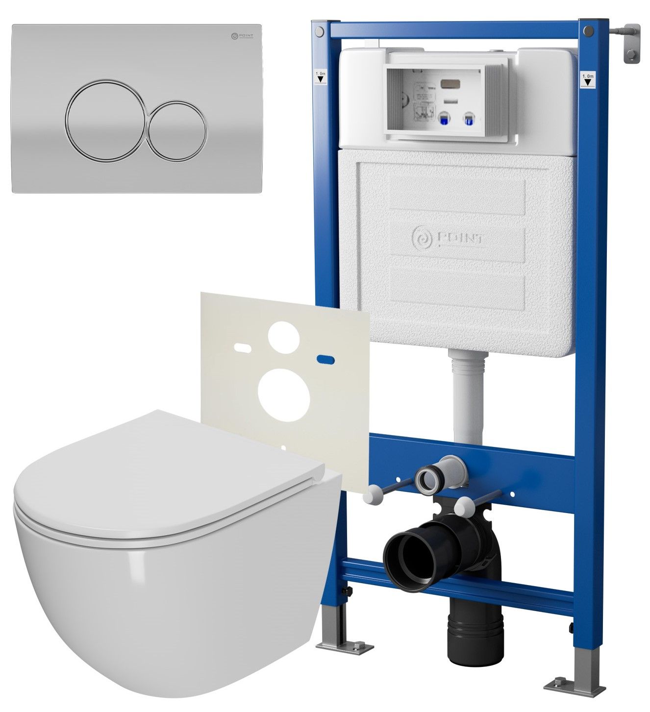 Сет: Система инсталляции Point Элемент для подвесного унитаза PN45120 + Клавиша смыва для инсталляции Point Виктория, цвет сатин/хром, PN44061SC + Унитаз подвесной Point Афина безободковый, сиденье микролифт PN41041