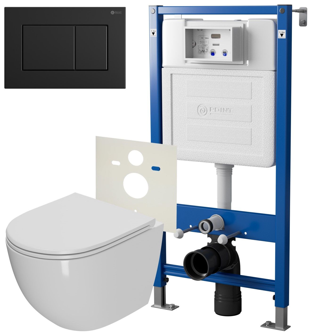 Сет: Система инсталляции Point Элемент для подвесного унитаза PN45120 + Клавиша смыва для инсталляции Point Ника, черная матовая, PN44081BM + Унитаз подвесной Point Афина безободковый, сиденье микролифт PN41041