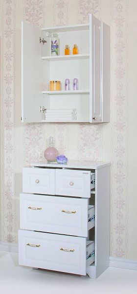 Основное преимущество шкаф заключается в его вместительности. Удобные полки и ящики позволяют организовать пространство и разместить все необходимое: от косметики до бытовых принадлежностей. Каждая деталь продумана для удобства использования, что делает утренние и вечерние ритуалы более приятными.