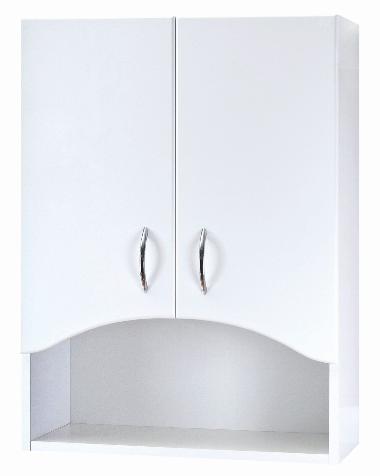За распашными дверцами с механизмом плавного закрывания скрывается вместительное пространство для хранения, разделенное 2-мя горизонтальными полочками которое подойдет для размещения самого необходимого, а открытая полка под арочными сводами - для косметических средств или декоративных элементов.