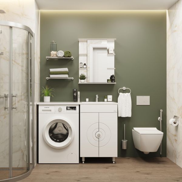 В центре шкафа - зеркальная дверца с механизмом плавного закрывания, за которой скрывается отделение для хранения, разделенное на две части горизонтальной полочкой. По бокам - открытые полочки для косметических средств или декоративных элементов.