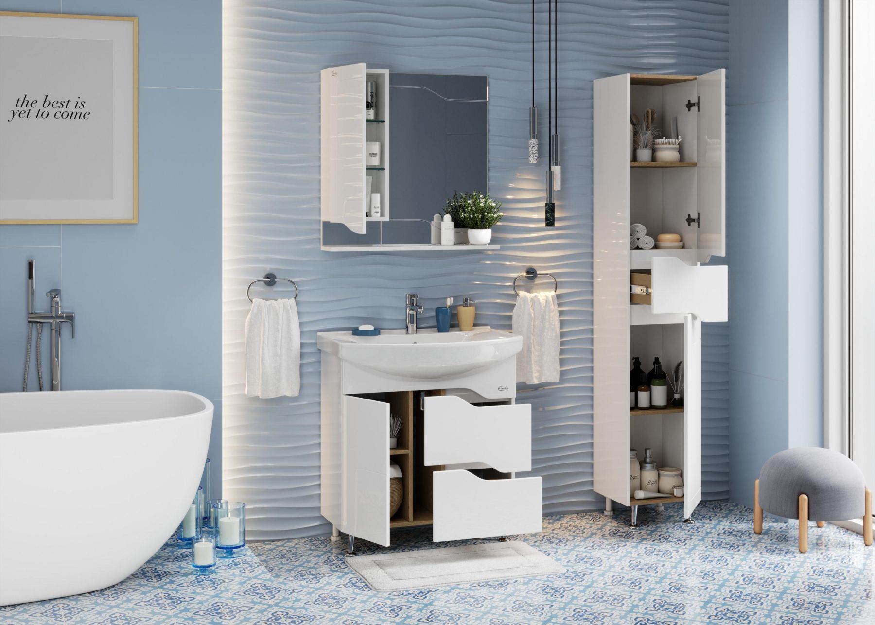 Современный функционал шкафа позволяет удобно расположить все необходимое: распашная дверца с механизмом плавного закрывания слева от зеркала скрывает объемное пространство для хранения, разделенное стеклянными полочками с еврокромкой. Большую открытую полку снизу можно использовать для декора или часто используемых предметов.