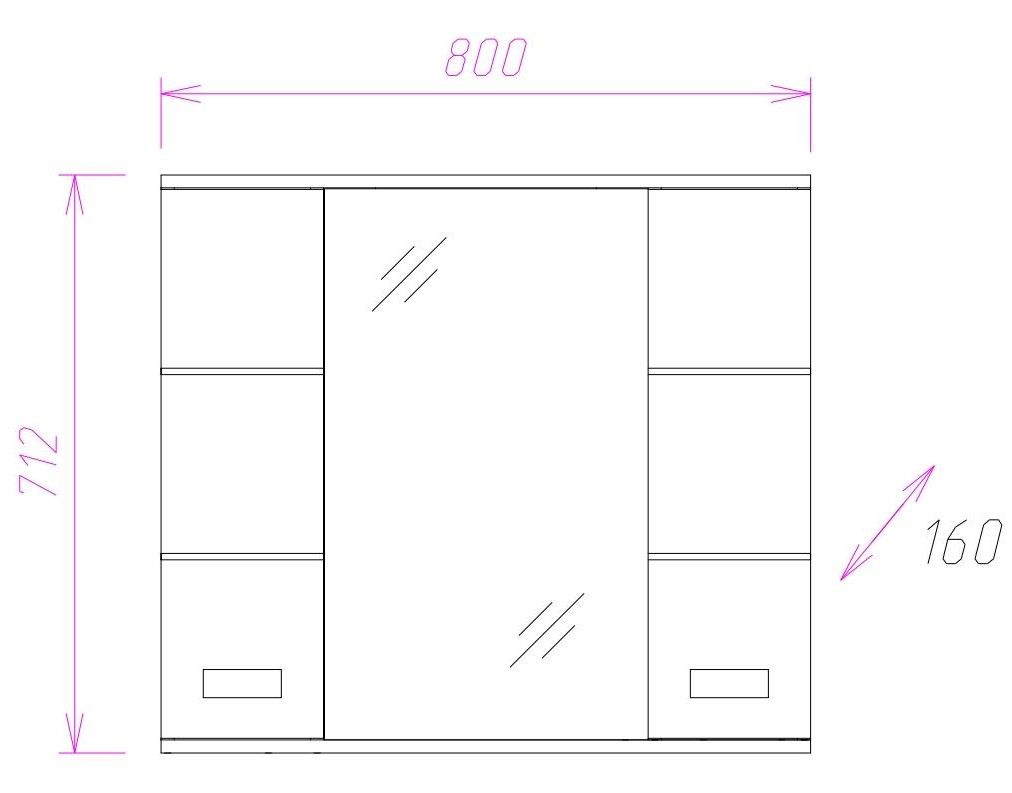 По бокам от зеркала за распашными дверцами с механизмом плавного закрывания расположены отделения для хранения, разделенные на две части горизонтальными полочками, под зеркалом - открытая полочка для косметических средств или декоративных элементов.