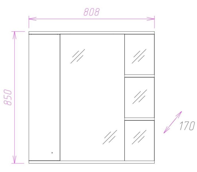 Современный функционал шкафа позволяет удобно расположить все необходимое: справа от зеркала за распашной дверцей с механизмом плавного закрывания расположено отделение для хранения, разделенное на три части горизонтальными полочками, слева и внизу под зеркалом - открытые полочки для косметических средств или декоративных элементов.