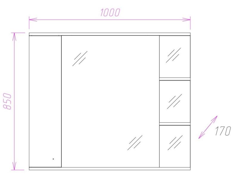 Современный функционал шкафа позволяет удобно расположить все необходимое: справа от зеркала за распашной дверцей с механизмом плавного закрывания расположено отделение для хранения, разделенное на три части горизонтальными полочками, слева и внизу под зеркалом - открытые полочки для косметических средств или декоративных элементов.