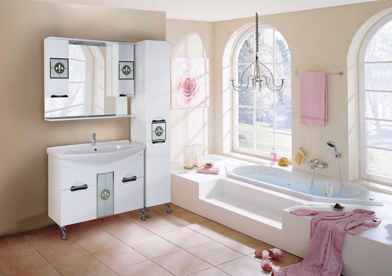 Глянцевый белый цвет подчеркивается врезной хромированной фурнитурой, изысканный стиль шкафа дополняет декоративный витраж на зеркальном полотне.