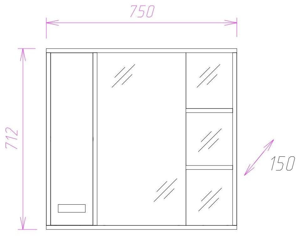 Слева от зеркала за распашной дверцей с врезной ручкой и механизмом плавного закрывания расположено отделение для хранения, разделенное на две части горизонтальной полочкой, справа - небольшие открытые угловые полочки.