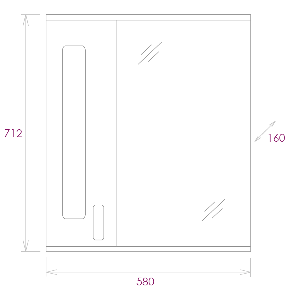Слева от зеркала за распашной дверцей с механизмом плавного закрывания расположено отделение для хранения, разделенное полкой, под зеркалом - открытая полочка для косметических средств или декоративных элементов.