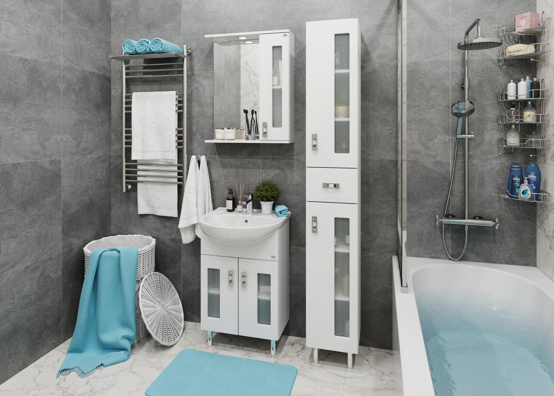 Белоснежный цвет фасада в сочетании со вставками из матового стекла и хромированными ручками необычной формы придадут ванной комнате ощущение свежести, чистоты и уюта.