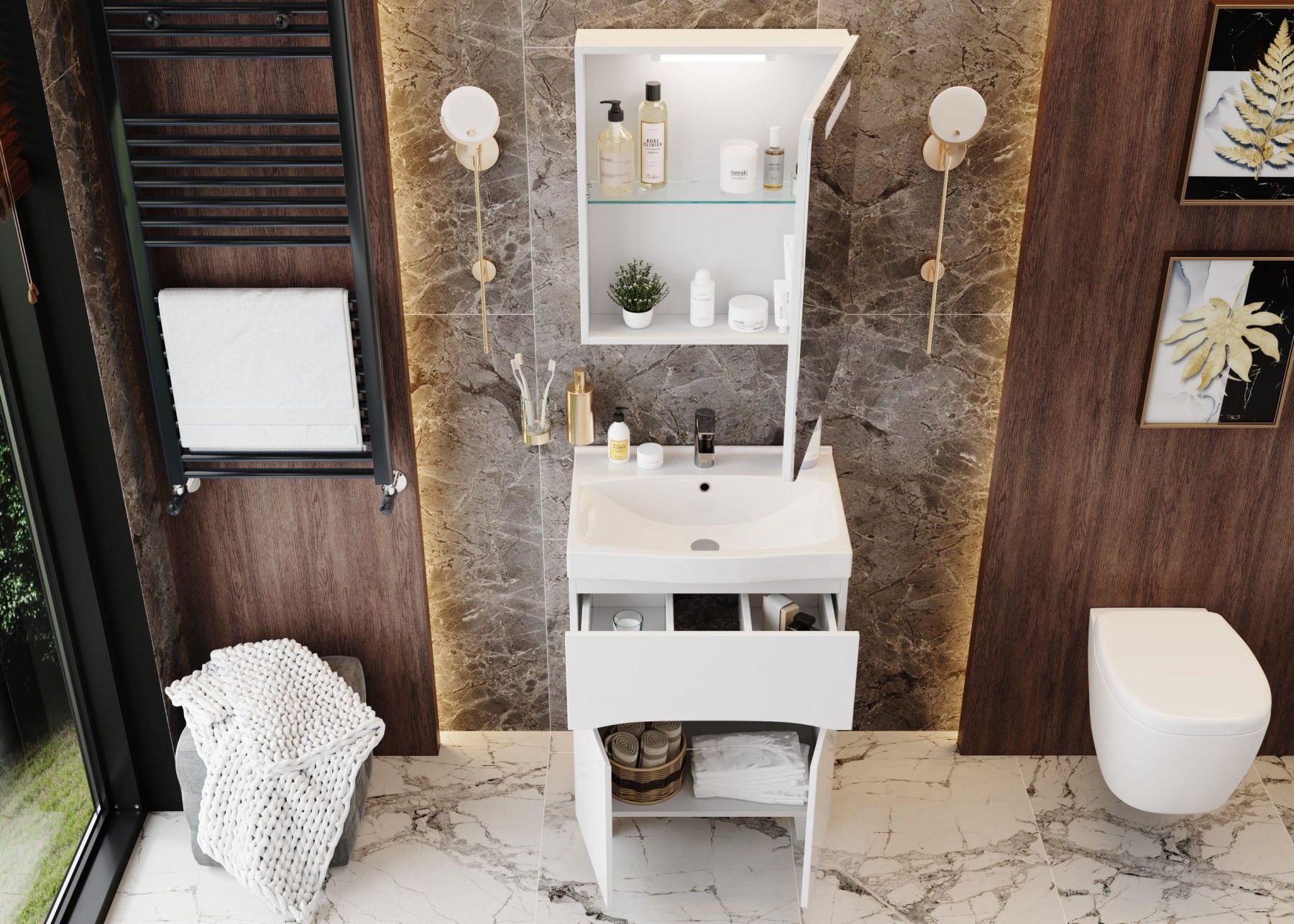 Дверца с механизмом плавного закрывания - она же зеркальный фасад со скошенными углами и светодиодной подсветкой, скрывает вместительное пространство для хранения, разделенное стеклянной полочкой с еврокромкой.