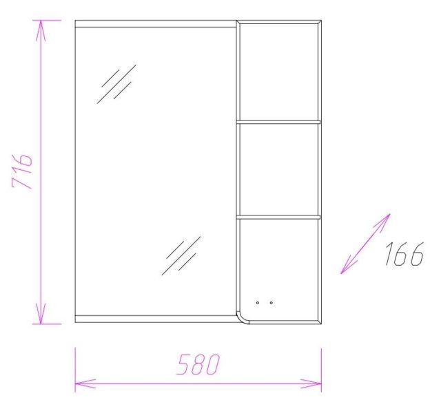 Справа от зеркала за распашной дверцей с неброской горизонтальной фрезеровкой и механизмом плавного закрывания, расположено отделение для хранения, разделенное полкой. Под зеркалом - открытая полочка для косметических средств или декоративных элементов.
