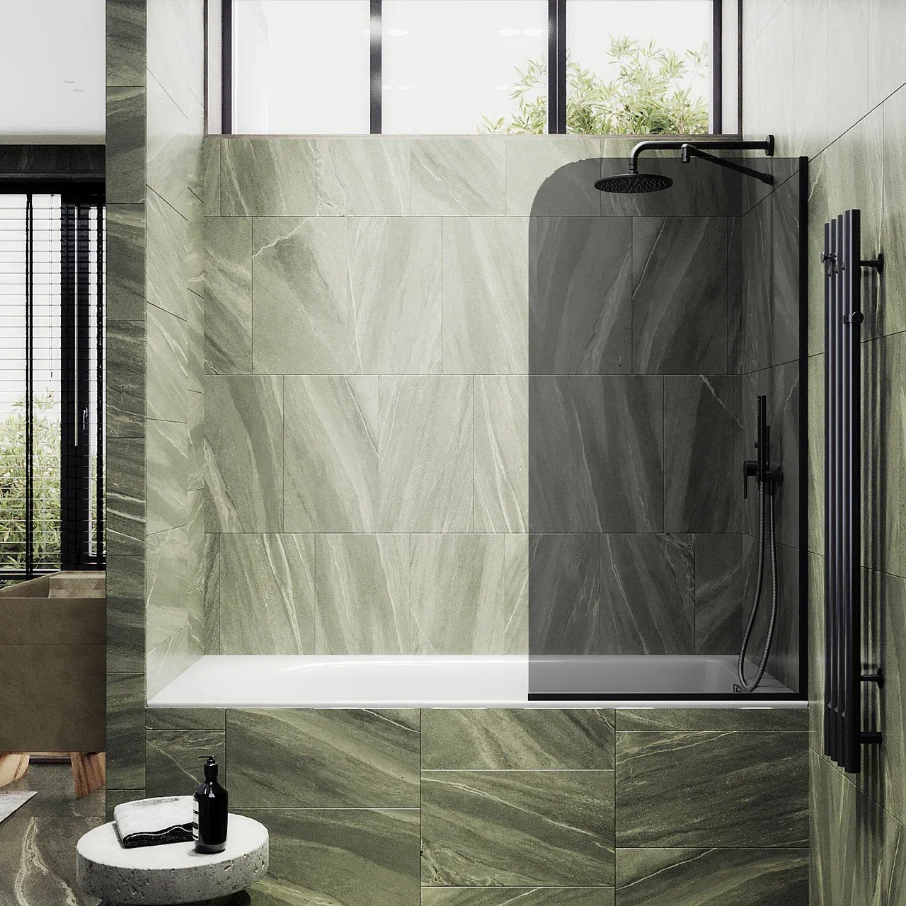 Монтаж осуществляется с помощью алюминиевого профиля, что обеспечивает надежность крепления и безопасность использования стеклянной перегородки для ванной. Также, шторка оснащена специальным уплотнителем, который предотвращает попадание воды на пол ванной комнаты. Закаленное стекло, цвет Графит,толщина 8 мм 1400х300 мм - 1 шт.