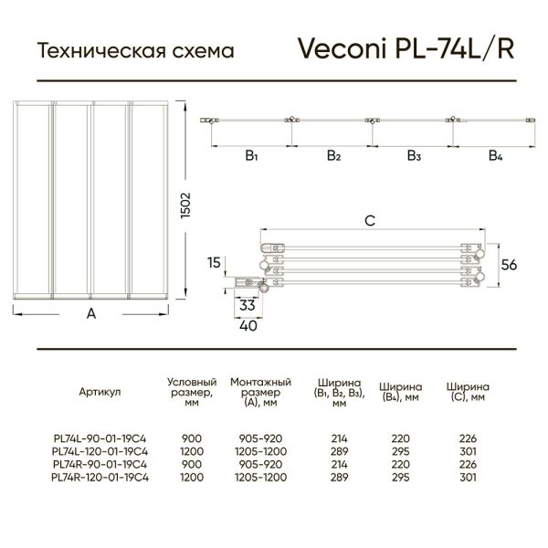 Шторка на ванну Veconi Palau PL-74R, 1200x1500, хром, стекло прозрачное