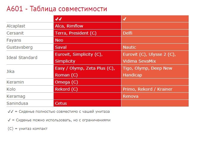 - Для унитазов в соответствии с таблицой совместимости