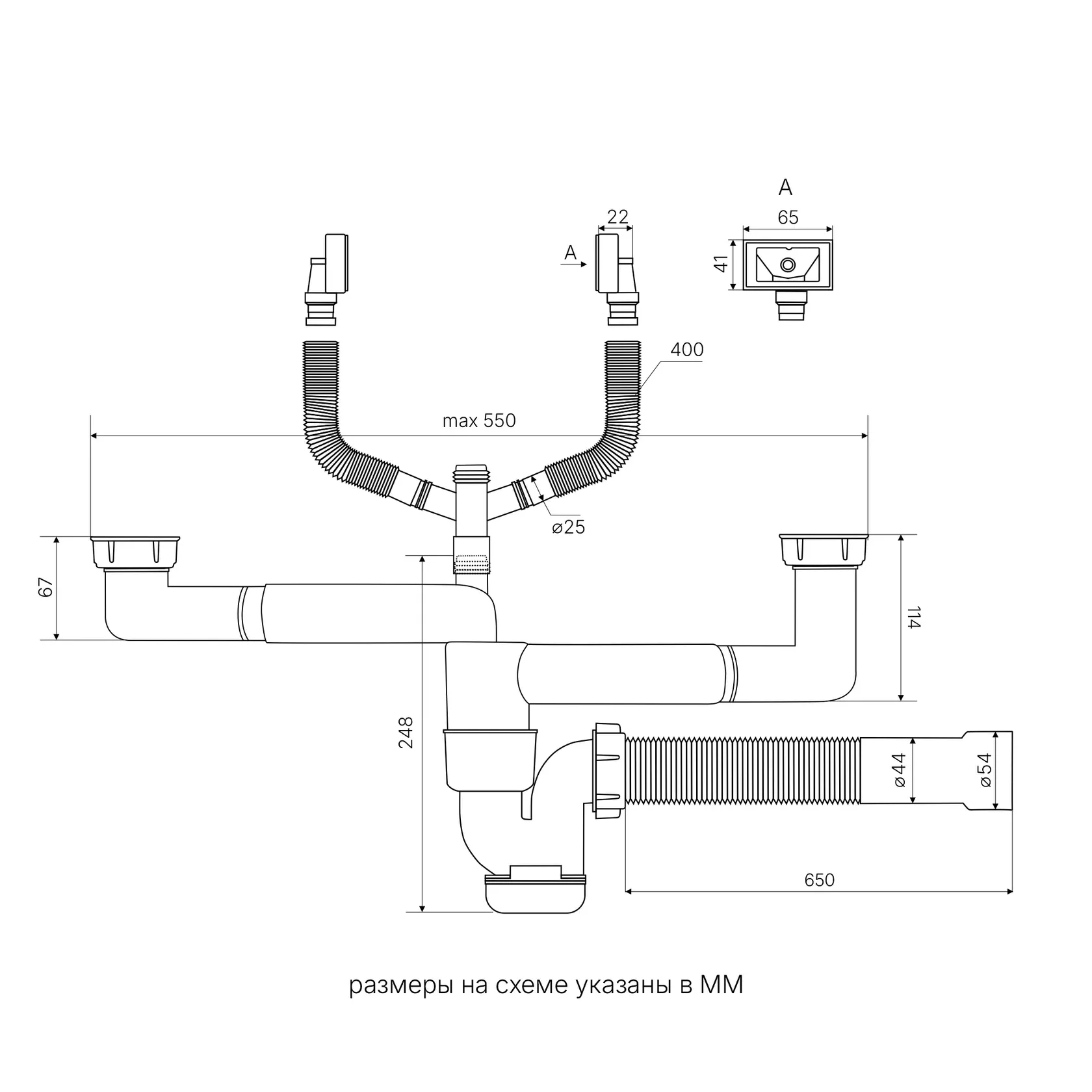 Сифон для двучашевой кухонной мойки БЕЗ ВЫПУСКА Reflexion Part RX9002PT
