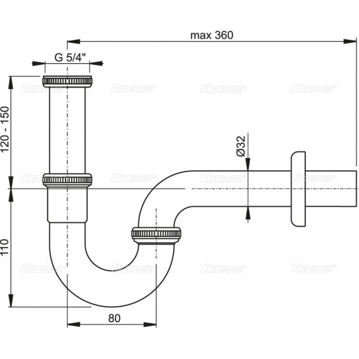 Сифон для раковины AlcaPlast ?32 U-форма цельнометаллический с накидной гайкой 5/4" A4320