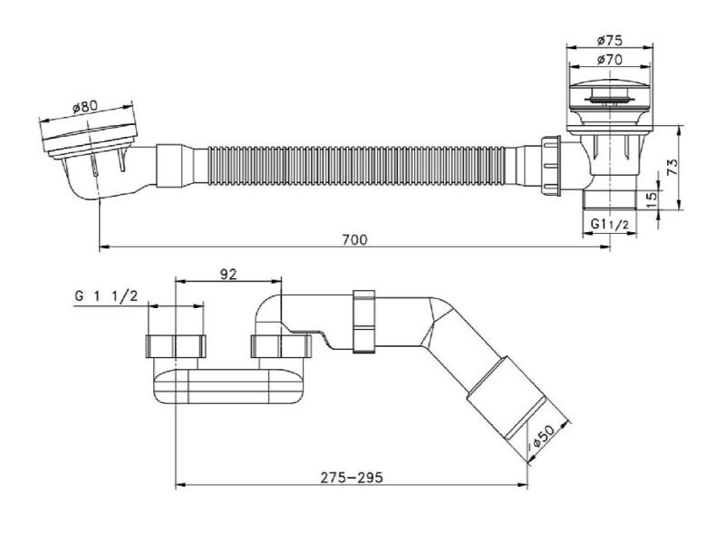 Слив-перелив 1 1/2"х40/50, с переливом и автоматическим сливом для ванн и глубоких душевых поддонов. Конструкция сифона позволяет прочищать сифон, не демонтируя его. С отводом в канализацию.