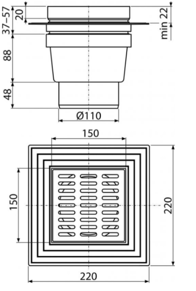Сливной трап AlcaPlast 150 ? 150/110мм воротник – 2-х уровневая изоляция решетка - хром APV13