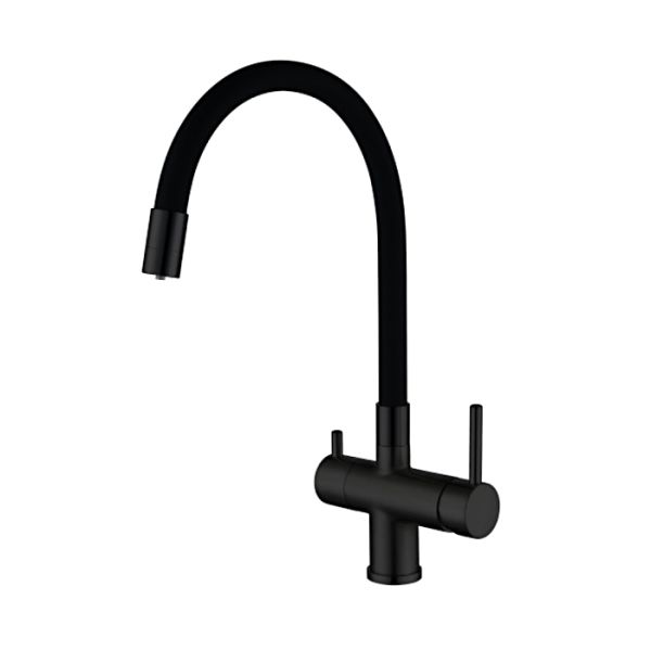 Смеситель для кухонной мойки Gappo G4398-36 с подключением фильтра питьевой воды - однорычажный смеситель из латуни с черным матовым покрытием и гибким изливом из силикона. Смеситель подключается к системе очистки воды.