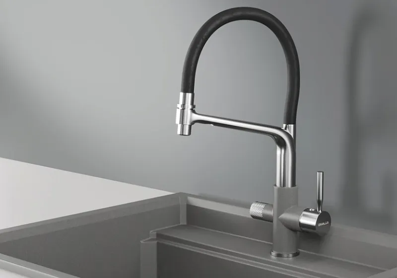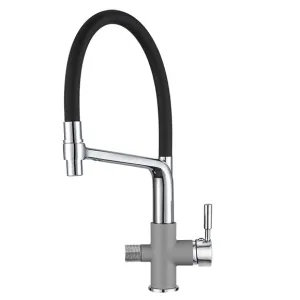 Смеситель для кухни. Цвет-алюминиум. В комплект поставки входит: смеситель, гибкая подводка, комплект креплений, переходник для подключения фильтра с питьевой водой