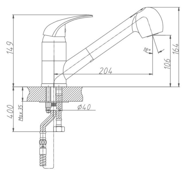 Смеситель для кухни бренда Haiba.Изготовлен из латуни.Картридж 40 мм.Укомплектован аэратором.Гибкая подводка 40 см.С поворотным изливом.