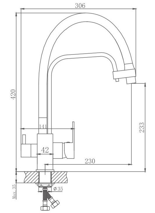 Смеситель для кухни бренда Haiba.Изготовлен из латуни.Картридж 35 мм.Укомплектован аэратором.Гибкая подводка 40 см.С поворотным гибким изливом