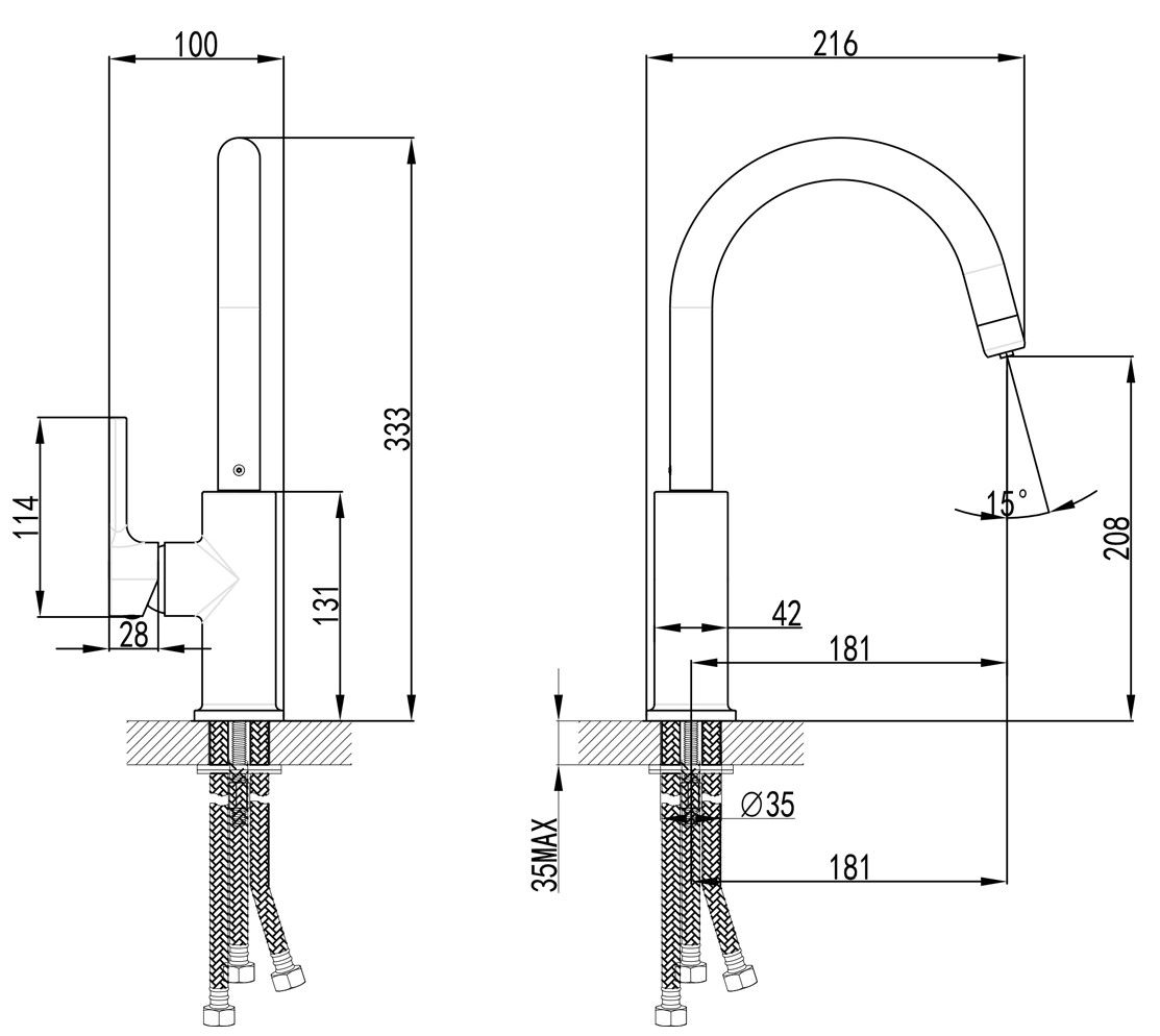 При повороте ручки в вертикальной плоскости на 90 градусов, питьевая вода из фильтра подается через комбинированный аэратор по встроенному каналу в изливе и не смешивается с обычной водой. Управление температурой и напором струи производится привычным способом.