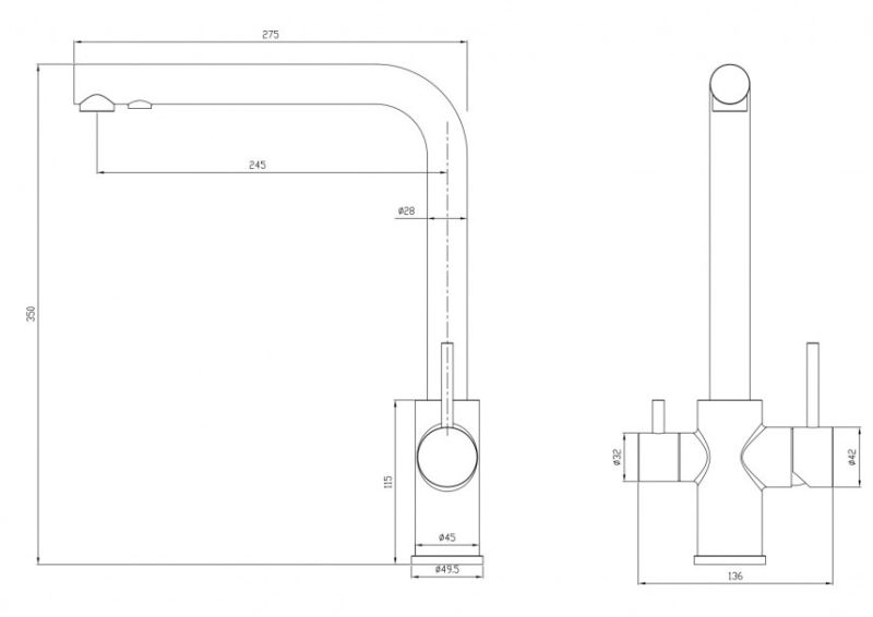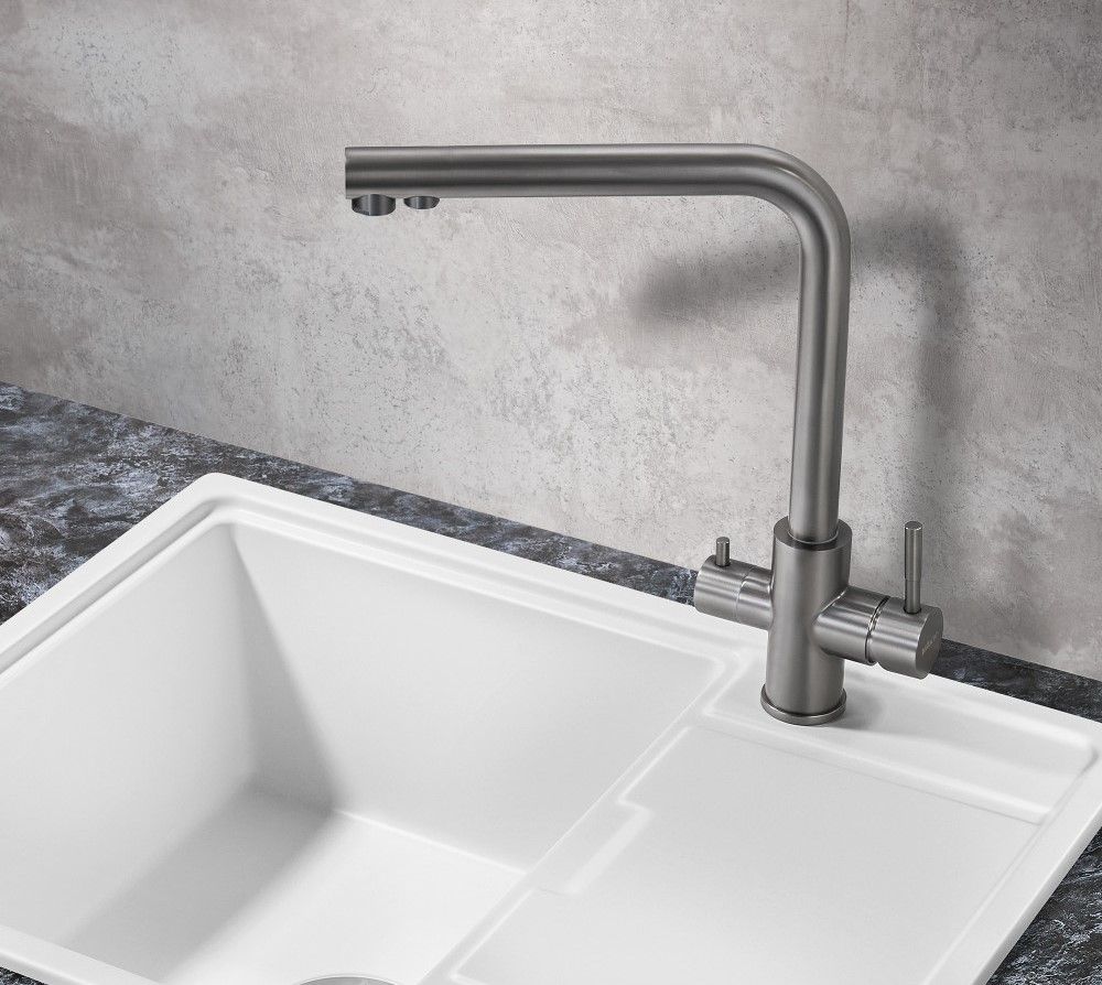 Один кран совмещает в себе две функции: подача воды для бытовых нужд + подача фильтрованной воды для питья. Два независимых друг от друга канала не только исключают возможность перекрестного смешивания воды, но и избавляют от необходимости устанавливать дополнительный кран для фильтра, что освобождает рабочее пространство и не перегружает общий вид кухни. Простая регулировка подачи обычной и питьевой воды осуществляется с помощью двух обособленных рычагов, установленных на одном корпусе (один рычаг — для бытовой воды, второй — для фильтрованной). Гибкая подводка идет в комплекте.