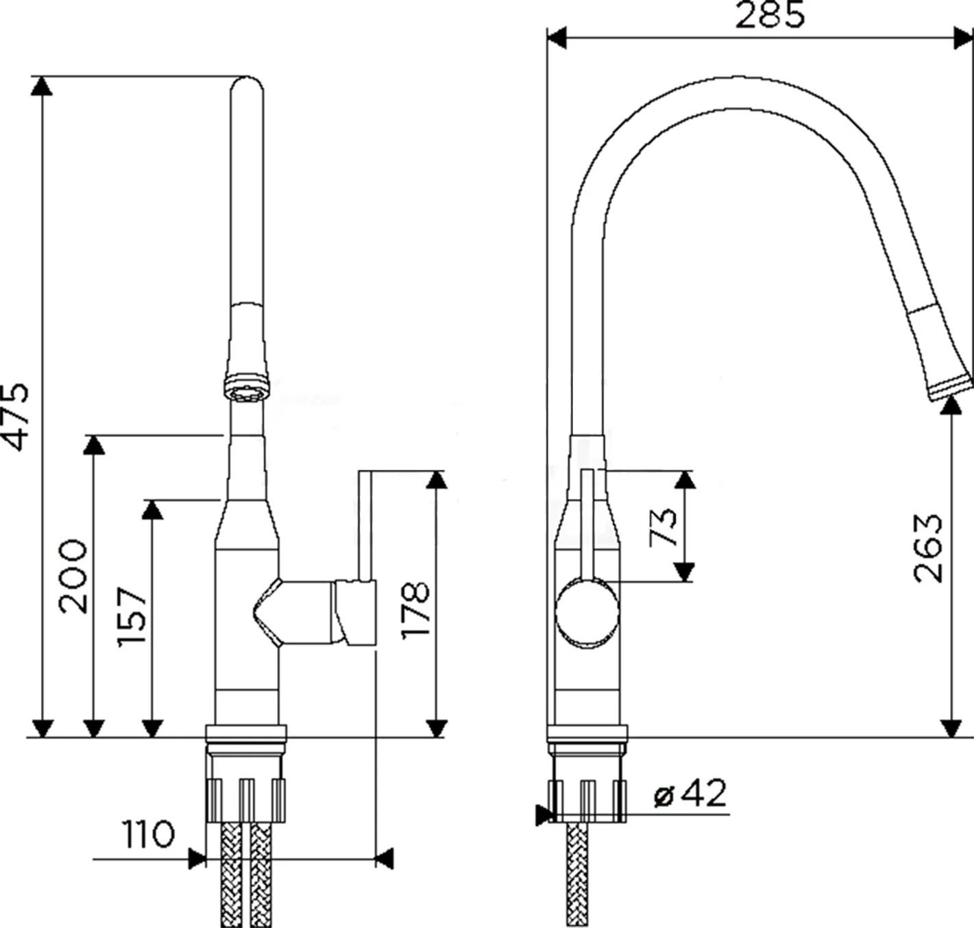 • Смеситель снабжен высоким поворотным шлангом, который при изменении формы всегда остается в устойчивом положении