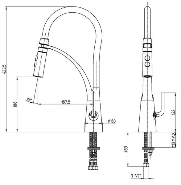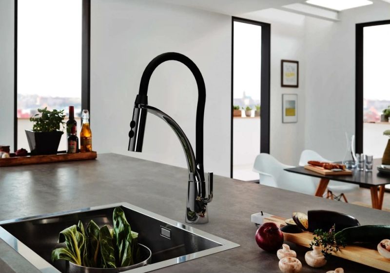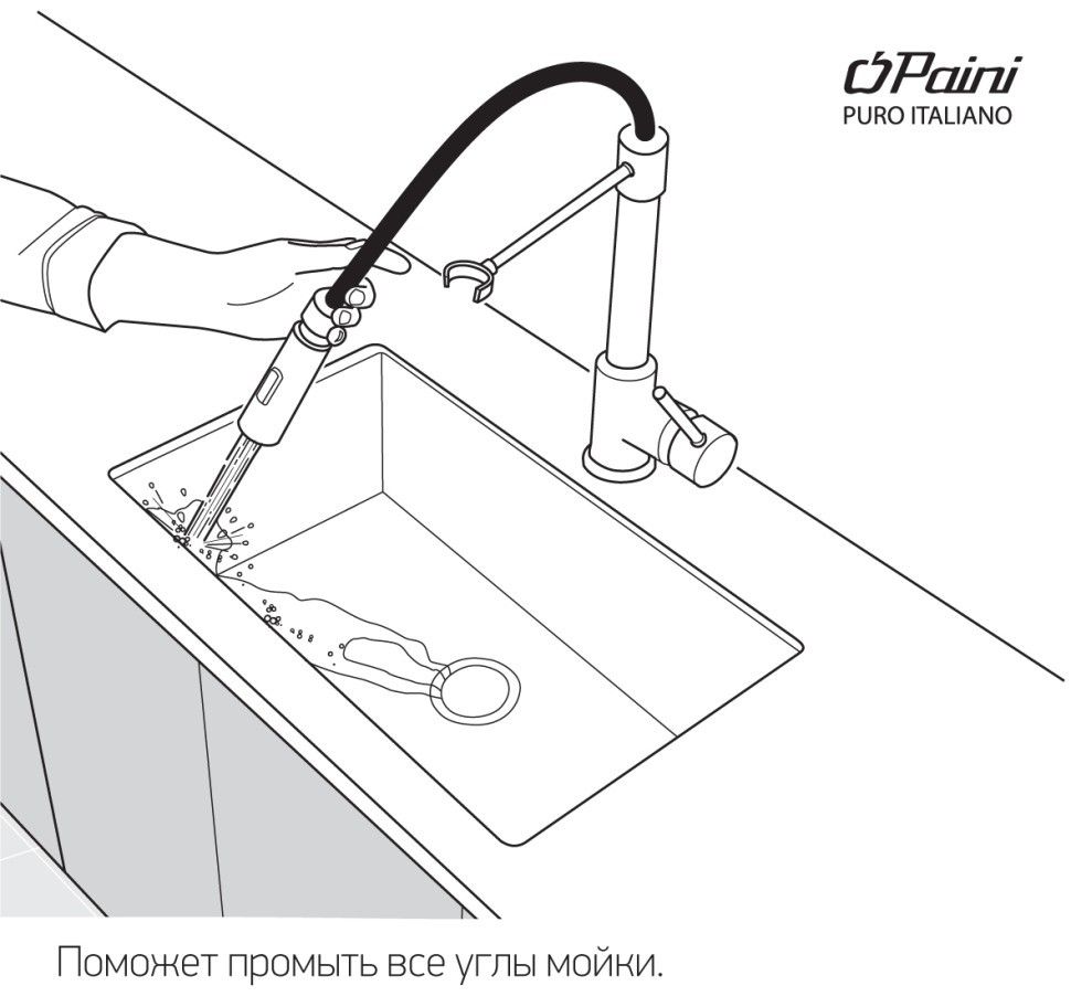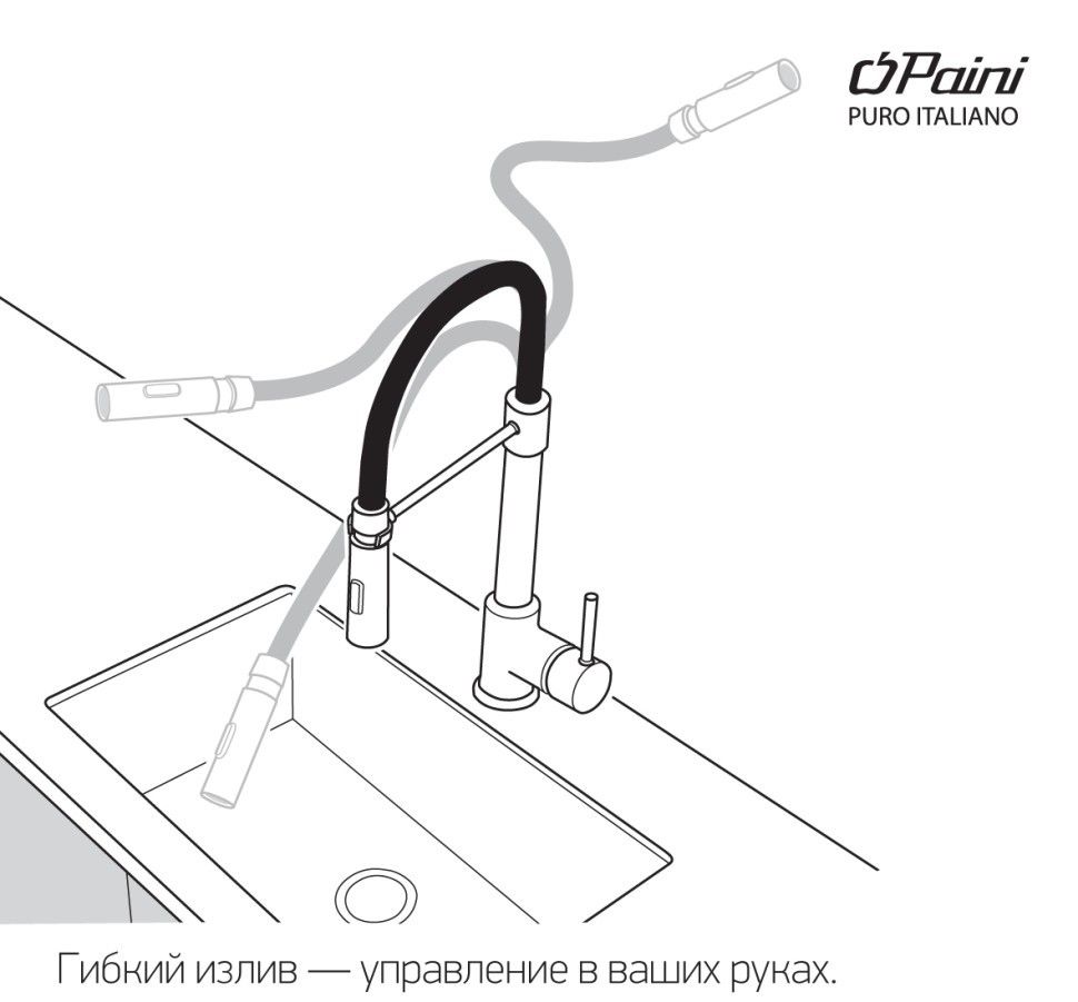 Высокий поворотный излив смесителя для кухни «ПАИНИ» позволяет менять направление потока воды, использовать глубокую посуду, а гибкая лейка удобна для того, чтобы набрать воду, помыть продукты и так далее.
