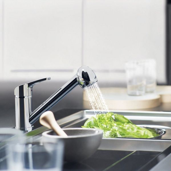 • Выдвижная лейка с несколькими режимами подачи воды, управление на корпусе лейки.