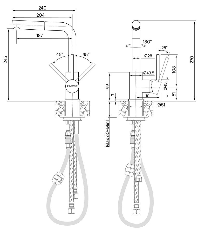 Смеситель для кухни с выдвижным шлангом, Ka214311-431TWИзготовлен из высококачественной латуни, которая отвечает высочайшим европейским стандартам качества, не содержит свинца, не разрушается со временем и безопасна для здоровья.Вытяжной шланг
