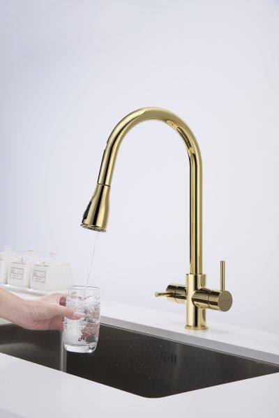 Смеситель под фильтрованную воду с выдвижным шлангом, артикул La214212-GИзготовлен из высококачественной латуни, которая отвечает высочайшим европейским стандартам качества, не содержит свинца, не разрушается со временем и безопасна для здоровья.Вытяжной шланг